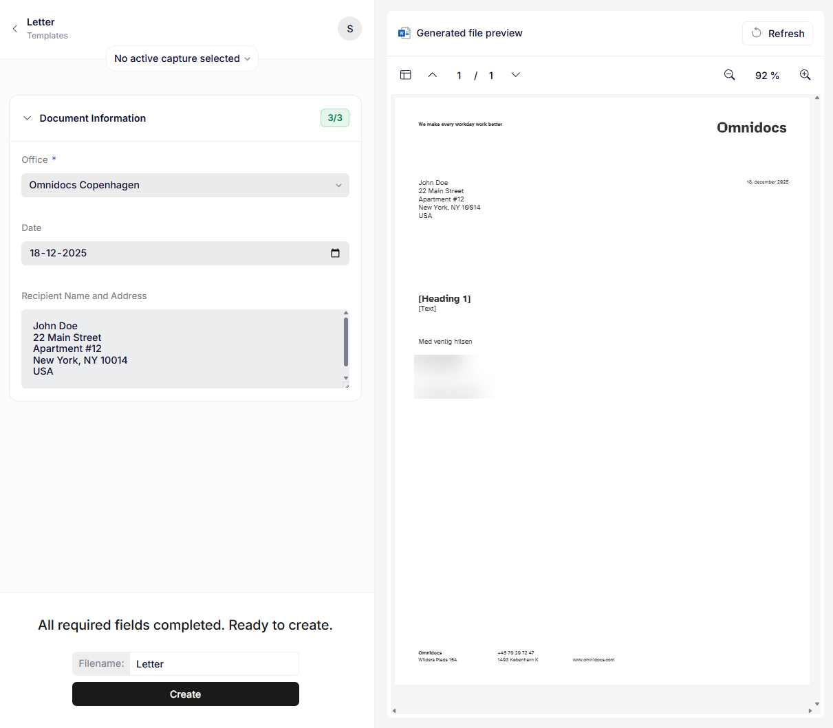 With all required fields filled out, you are now ready to generate the document by adjusting the filename to your liking and pressing the Create button.