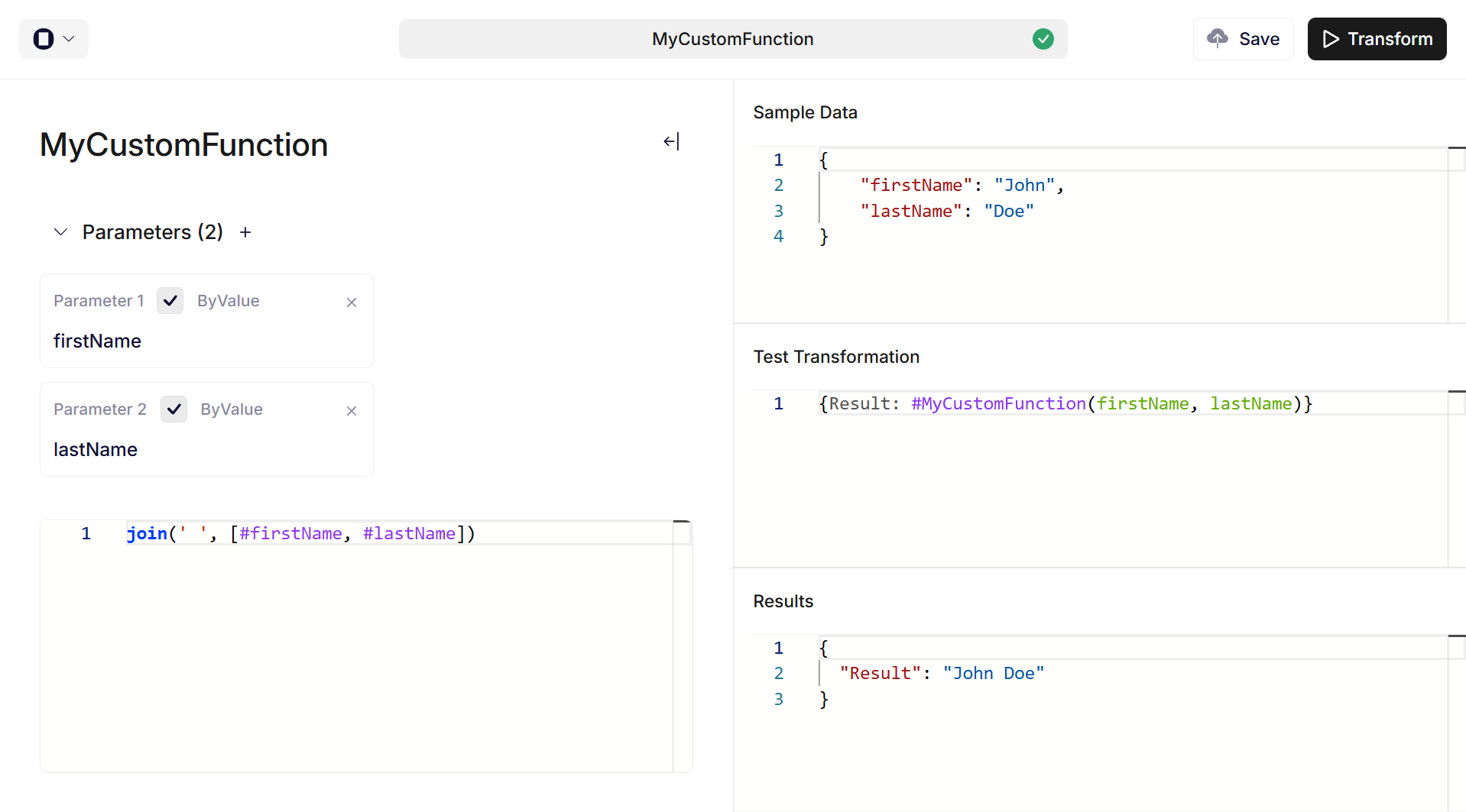 Define parameters at the top of the Function Pane. Select the + button next to Parameters to create one. Each parameter needs a name. The name is used when writing the transformation in the editor below.