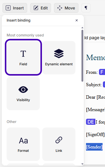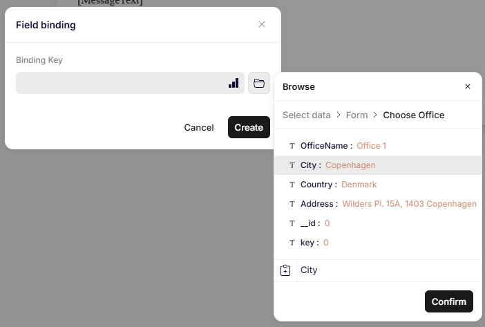 The value is now ready to be inserted in the document when selecting a row in the form.