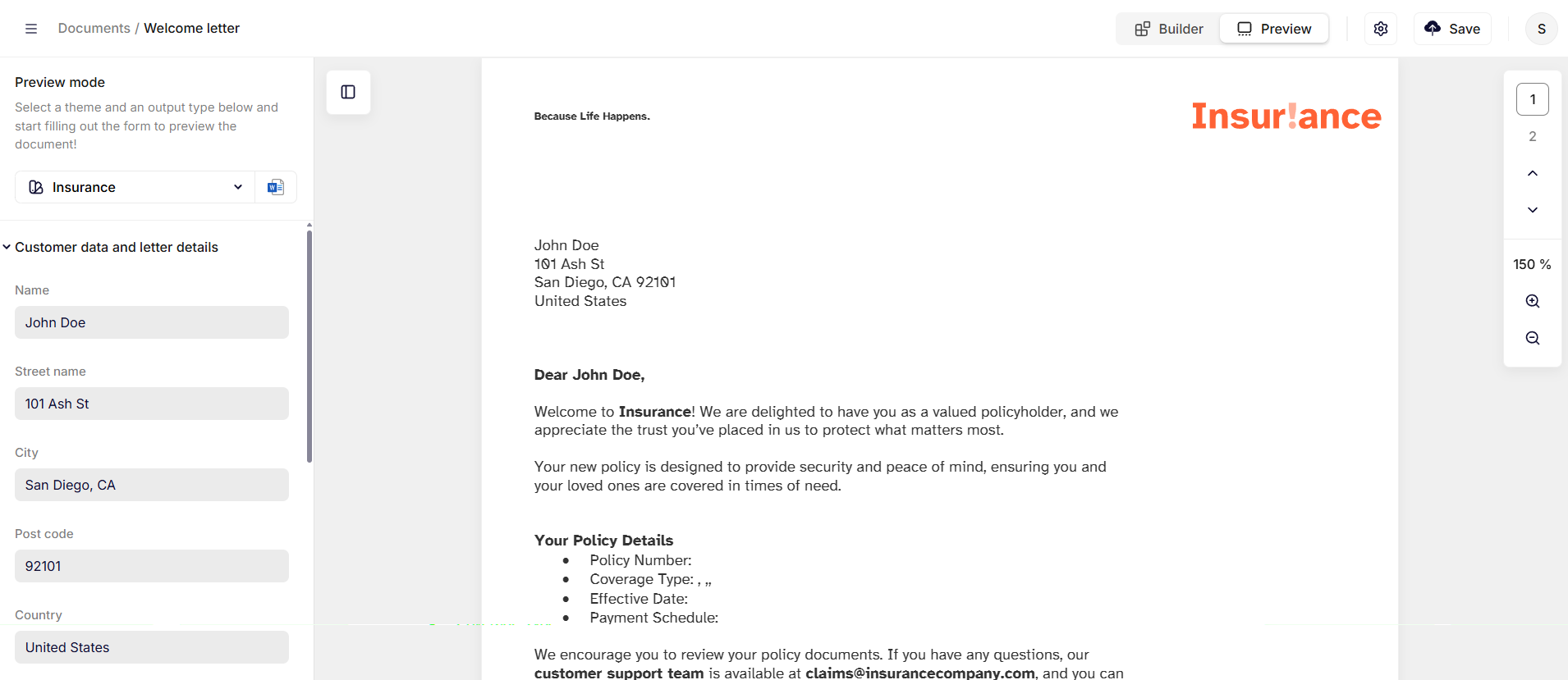 The Preview mode allows you to test and validate how a document will look when it is generated based on your template.
