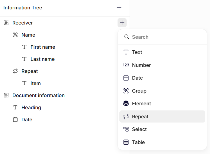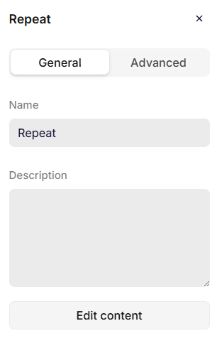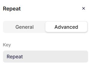To add a Repeat node, click the plus (+) icon in your section and select Repeat.