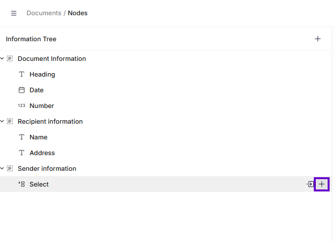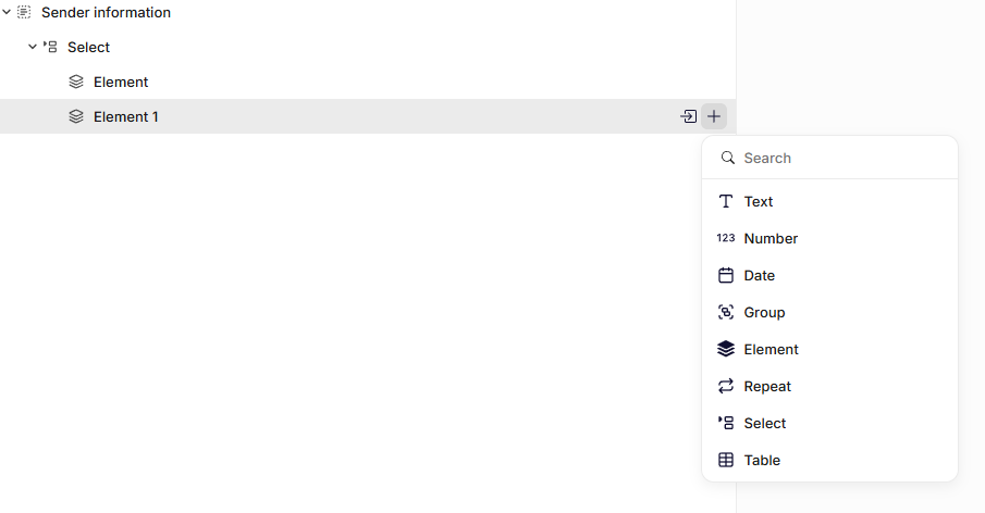 To add an option, click the plus (+) icon inside the Select node in the Information Tree. Then choose Element.